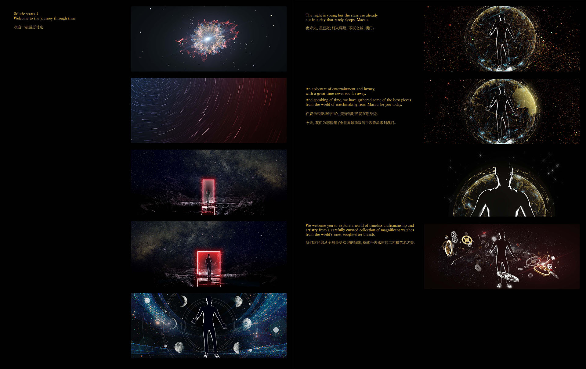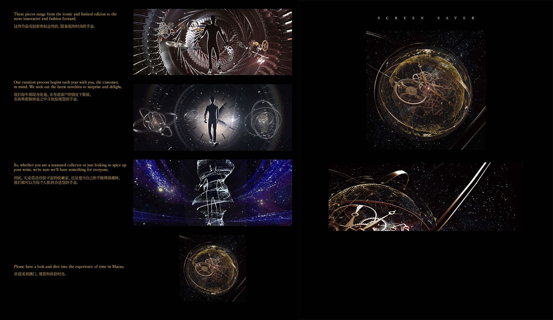 這是一個 DFS 在澳門手錶展覽會的影片。 時間大使為展覽會揭開序幕,歡迎大家來到手錶設計的時光之旅。探索手錶永恆的工藝與藝術之美,運用未來感和時間的設計元素,掌握每分每秒,走在屬於自己的時空當中。
